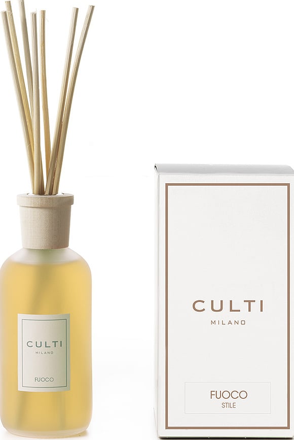El difusor de aroma Culti Stile Classic Fuoco es una fragancia ligeramente misteriosa y oriental, rebosante de cítricos y clavo. El set incluye también varillas de ratán que liberan la fragancia en el ambiente. El tapón está elaborado con madera de arce natural y adornado con un anillo metálico. Por su parte, el líquido se presenta en una elegante botella de cristal.
