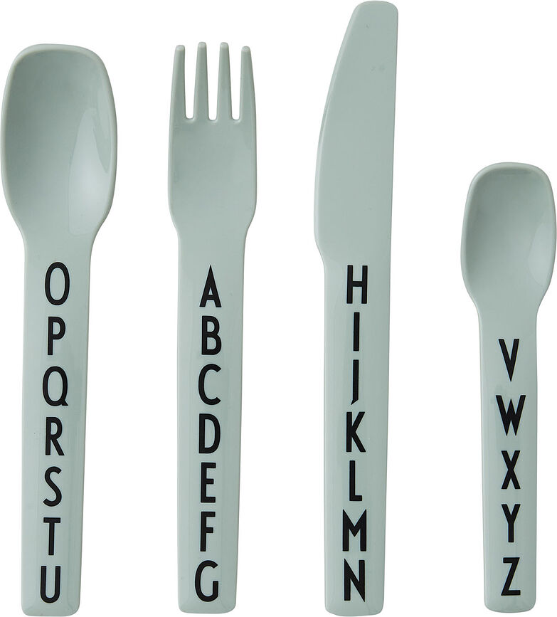 El set de cubiertos de la línea AJ Kids que aquí se presenta, al igual que toda la vajilla y los accesorios de esta serie, está fabricado en melamina y decorado con letras del alfabeto en los mangos. Los cubiertos —cuchillo, tenedor, cuchara y cucharilla— son, por lo tanto, perfectos para las comidas diarias, ¡además de un accesorio para aprender las letras y el ABC del diseño! Los cubiertos varían en longitud de 12,2 cm a 17 cm.