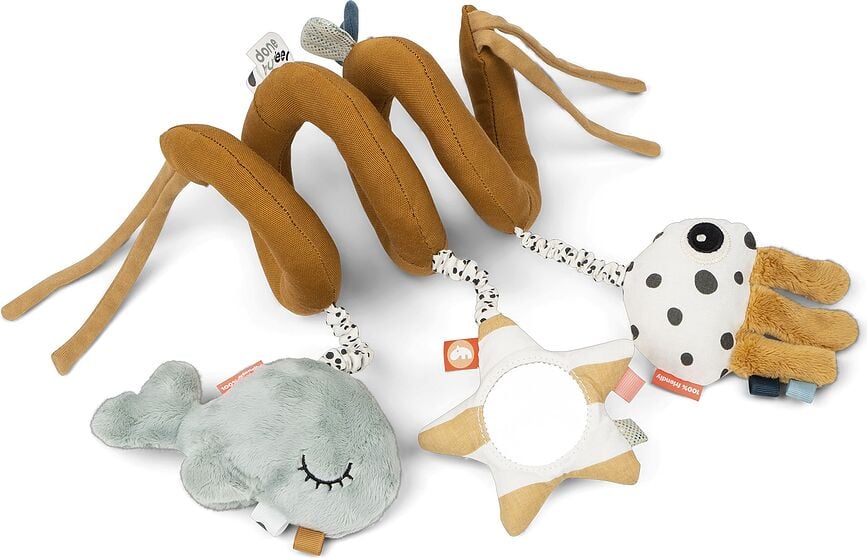 La espiral educativa de la colección Sea de Done by deer viene equipada con cuerdas para atar. El set incluye 3 colgantes: una estrella con espejo, la medusa Jelly y la ballena Wally con cascabel.