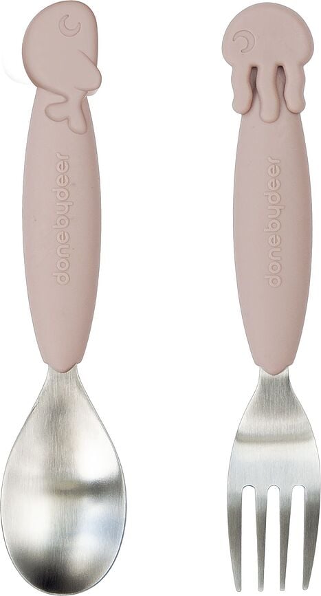 Los cubiertos infantiles de acero inoxidable de la colección Sea Yummy de Done by deer tienen mangos antideslizantes de silicona. El set incluye 2 piezas: una cuchara y un tenedor.