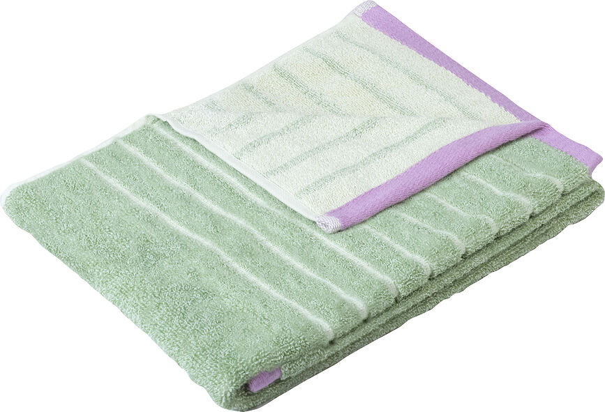 La toalla de baño de Hübsch, altamente absorbente y con un tacto delicioso, es de color beige-azul y está decorada con finas rayas. Queda de maravilla en baños luminosos y llenos de luz.