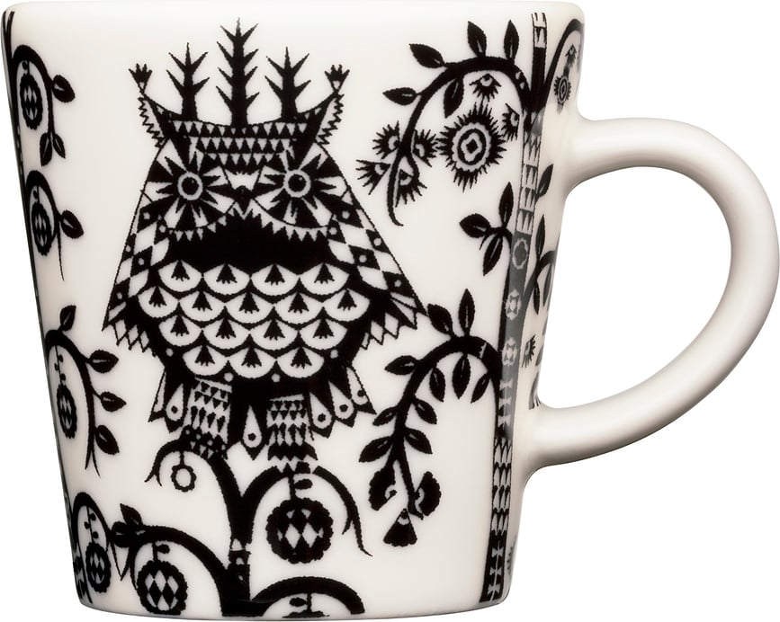 Taza y platillo de espresso de la colección Iittala Taika con decoración en negro.