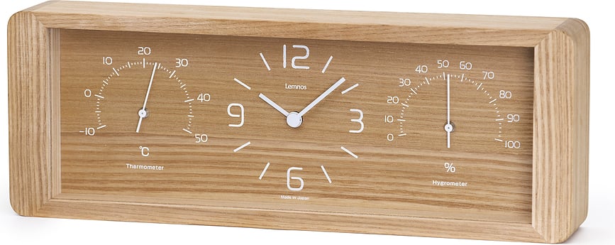 El reloj Yokan es un diseño práctico, multifuncional y a la vez elegante de la marca Lemnos. Dentro de su carcasa rectangular con esquinas redondeadas, fabricada en madera de fresno o nogal, y detrás de un cristal, encontrará un termómetro, un reloj y un higrómetro. Estos le permiten determinar la temperatura interior, la hora y el porcentaje de humedad del aire. Los indicadores blancos resaltan maravillosamente sobre la esfera de madera, convirtiendo este reloj en el complemento perfecto para interiores con muebles de madera, espacios de estilo escandinavo u oficinas. El reloj está equipado con un mecanismo japonés de cuarzo.