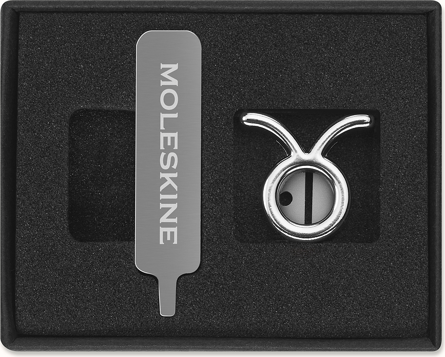 ¿Eres una Libra equilibrada, un Tauro apasionado o un Sagitario sociable? Sea cual sea tu signo del zodiaco, ¡ahora puedes lucirlo con estos pins plateados para libretas Moleskine! La decoración del signo del zodiaco se sujeta de forma rápida y sencilla a la banda elástica de tu libreta, gracias al tornillo y destornillador incluidos.