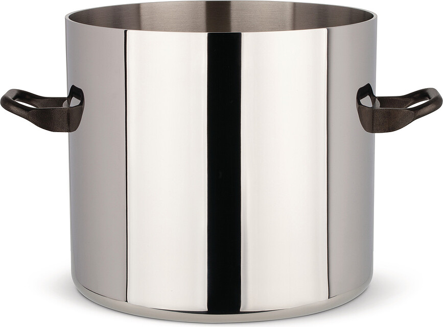 La olla alta que aquí presentamos es perfecta para preparar sopas y grandes cantidades de comida. Esta olla está fabricada con un compuesto de dos tipos de acero y un núcleo de aluminio, un excelente conductor del calor. El exterior de la olla está revestido con un acero AISI 430 pulido, de un brillo deslumbrante y una belleza extrema. El interior, por su parte, está hecho de higiénico acero 18/10. El aluminio intermedio es el responsable de las excepcionales propiedades térmicas de esta magnífica olla.