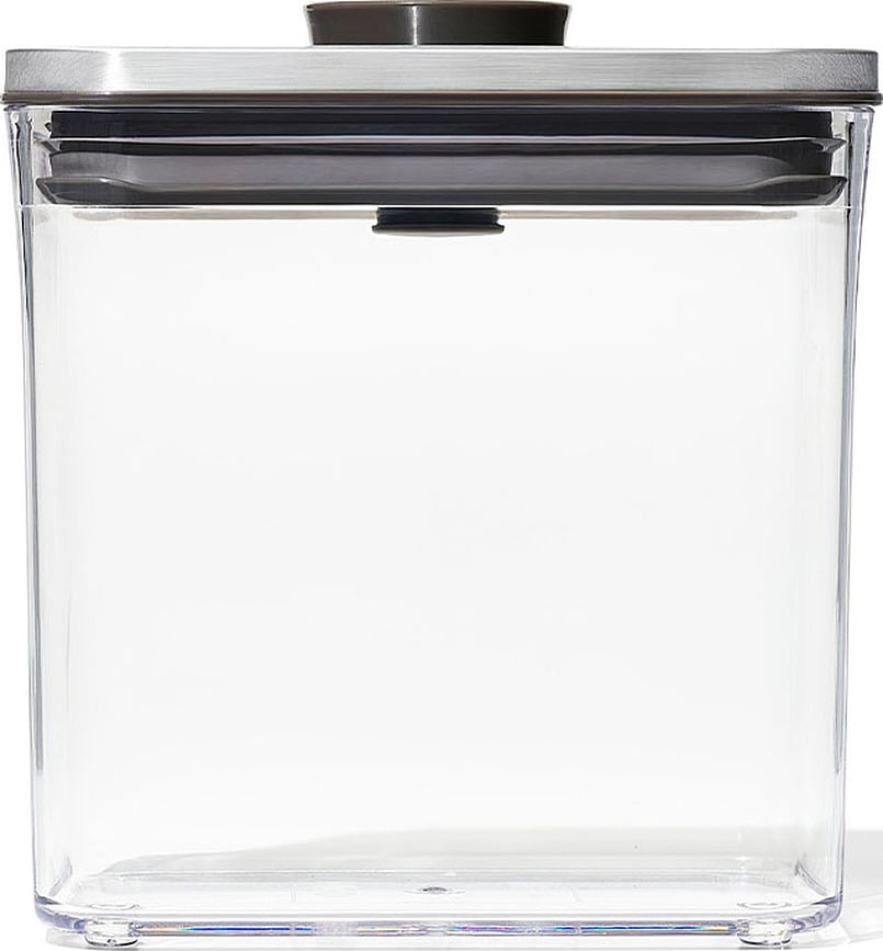 El recipiente de cocina Pop2 de Oxo cuenta con una tapa de acero inoxidable que incorpora un botón para un cierre hermético. Esto garantiza que los alimentos que guardes en su interior conserven su frescura por más tiempo, ¡como recién comprados!