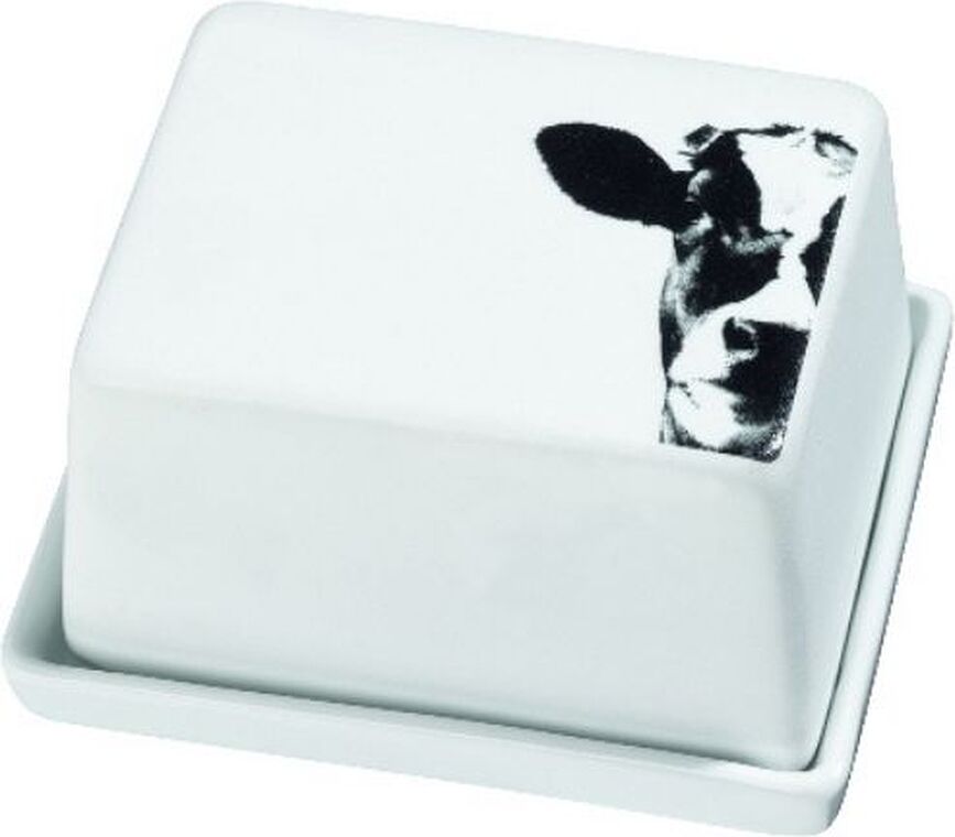 La mantequillera Muu de Räder, elaborada en porcelana blanca, está adornada con la simpática silueta de una cabeza de vaca en color negro. En el interior del platillo, se puede leer la divertida inscripción "muu. muh". Además, es un placer limpiarla, ¡tan fácil como la tabla del uno!