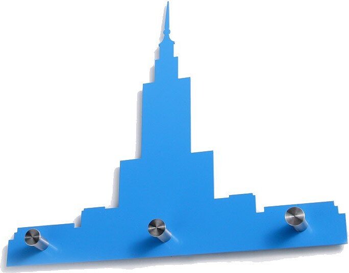 ¿Te suena de algo? El Palacio de la Cultura y la Ciencia de Varsovia es innegablemente uno de los símbolos de la capital polaca. Entonces, ¿por qué no introducir su imagen en los interiores polacos (y otros), tal como hacemos con otros puntos de referencia de ciudades de todo el mundo? El diseñador polaco Robert Szuba te permitirá manifestar tus sentimientos patrióticos con un atractivo, disponible en muchos colores vivos, colgador triple Palace, cuya forma se asemeja al contorno del edificio de estilo realista socialista PKiN, situado en el corazón de Varsovia. Este práctico accesorio es perfecto para el recibidor como perchero o en la habitación de un adolescente como un práctico soporte para todo tipo de bolsos, auriculares, mochilas o... zapatillas. El colgador Palace recibió una mención de honor en el concurso Elle Decoration Prodeco 2008. El colgador es también un recuerdo perfecto de una visita a Polonia o un conmovedor regalo para tus compatriotas temporalmente en el extranjero. ¡Hecho en Polonia!