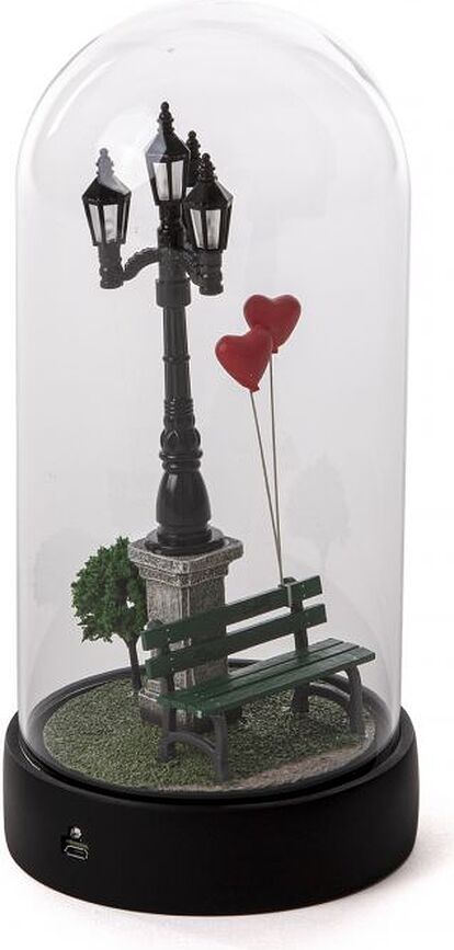 - La lámpara tiene forma de esfera de cristal, con una miniatura de resina en su interior.