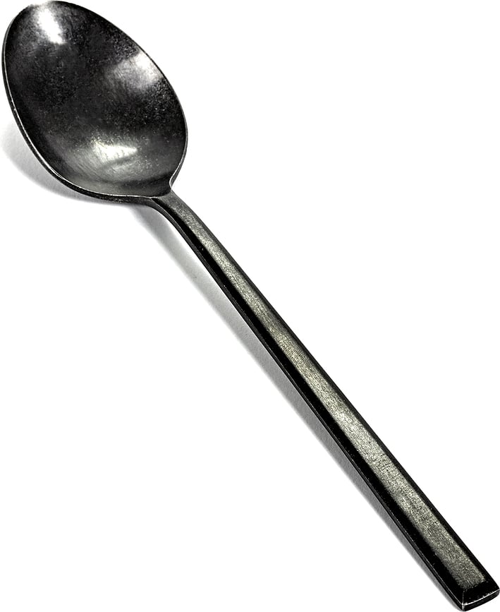 - Su revestimiento único, oscuro y con acabado mate, le confiere a los cubiertos un carácter sofisticado y a la vez relajado, inspirado en la tradición artesanal.
