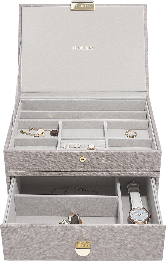 Versiones disponibles:- Joyero doble Stackers Classic, topo, con cajón, Joyero doble Stackers Classic, con cajón, beige claro, Joyero doble Stackers Classic, rosa claro, con cajón, Joyero doble Stackers Classic, gris, con cajón, Joyero doble Stackers Classic, azul marino, con cajón