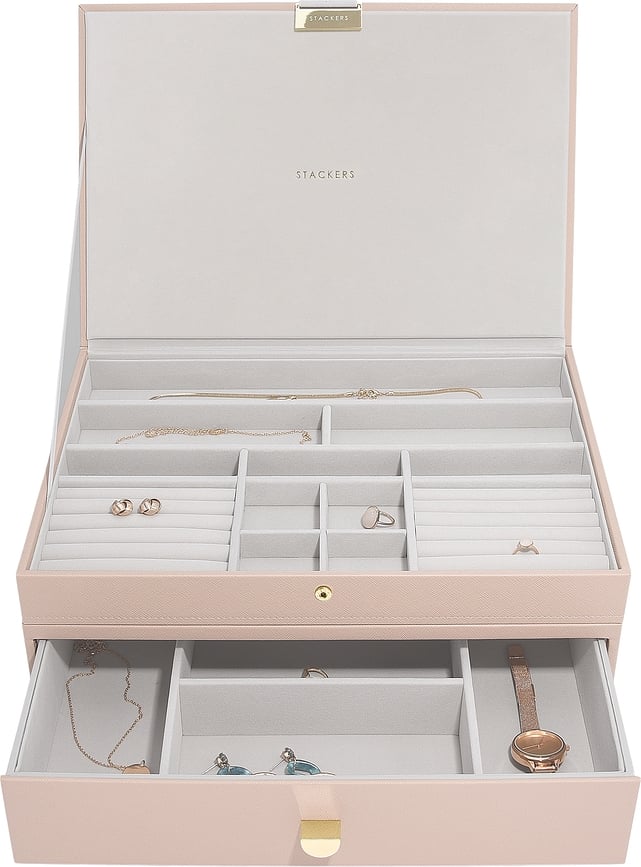 ¿Sientes que tu colección de joyas se te va de las manos y encontrar tu collar favorito es un reto diario? ¡Sabemos lo que se siente! Te presentamos el joyero doble supersize Stackers con cajón, que te ayudará a controlar el caos y a guardar todos tus tesoros con elegancia.
