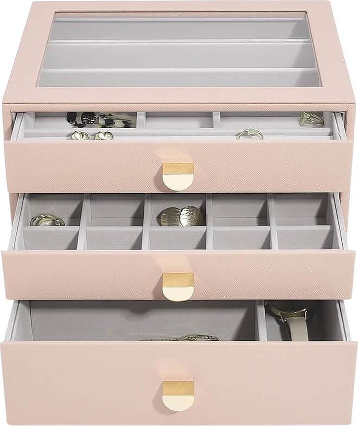 El elegante joyero de Stackers, equipado con cajones, es una pieza de mobiliario funcional y a la vez estéticamente agradable para tu guardarropa o dormitorio. Ofrece un amplio espacio para guardar tus tesoros, tanto grandes como pequeños, protegiéndolos del polvo y los arañazos. ¡Merece la pena conocerlo!