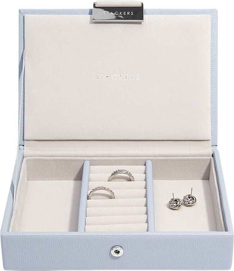 La caja de tamaño mini que aquí se presenta, con tapa y tres compartimentos principales, funcionará a la perfección como joyero para pulseras, collares y anillos, que se colocarán entre los rodillos del compartimento central. Los detalles típicos de todas las cajas de almacenamiento Stackers, como el elegante y práctico cierre magnético con el logotipo de la marca, la cinta que evita que la tapa se caiga, el acolchado de material suave y la cuidadosa mano de obra característica de todos los productos Stackers, son ventajas adicionales de la caja aquí presentada. Gracias a su tamaño compacto, la caja lucirá genial no solo en la cómoda del dormitorio o en el armario del baño, sino también en la maleta que acompaña a su dueña en viajes de negocios y escapadas de vacaciones.