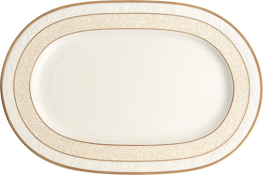 La bandeja ovalada de la colección Ivoire de Villeroy & Boch presenta un borde ricamente decorado y su elegancia se realza aún más con finas líneas doradas. Es perfecta para servir con distinción cualquier exquisitez: desde suculentos trozos de carne y delicados pescados hasta variados aperitivos y coloridas verduras.