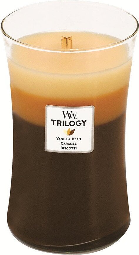 Si tomar café es uno de los mayores placeres de tu mañana y algo dulce siempre acompaña tu taza favorita, entonces la marca WoodWick tiene una vela para que disfrutes del aroma del café incluso a altas horas de la noche cuando te apetece relajarte. La vela Cafe Sweets que aquí se presenta de la colección Trilogy, caracterizada por una combinación en capas de tres tipos de cera con diferentes colores y aromas, combina 3 dulces aromas que definitivamente van de la mano con el sabor de un pequeño café negro: Vainilla, Caramelo y Biscotti. La vela se caracteriza por su elegante forma de reloj de arena y la tapa de madera típica de los productos WoodWick. La vela mediana con un peso neto mínimo de 275 g arde durante hasta 100 horas, mientras que la más grande de las velas con un peso neto mínimo de 608 g arde durante hasta 175 horas.